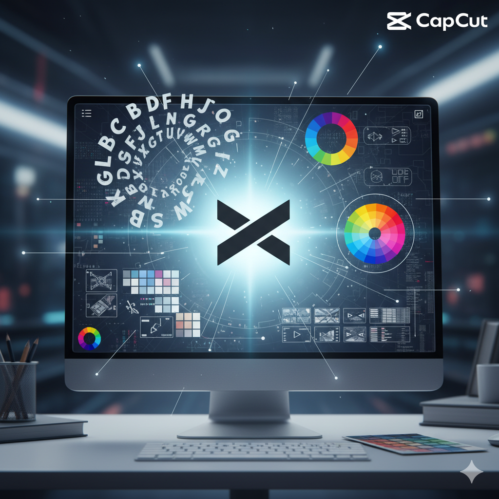 A sleek illustration of the CapCut logo (abstract black bowtie shape) glowing on a modern digital screen, surrounded by design tools like fonts, color palettes, and video frames.